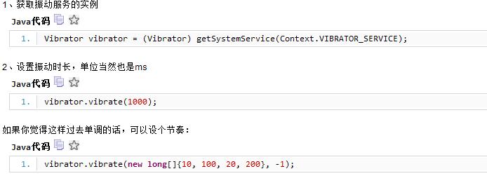 android.os.Vibrate代表著手機(jī)的振動(dòng)器。用法很簡(jiǎn)單,通過getSystemService()方法獲取示例,然后調(diào)用vibrate方法便可以實(shí)現(xiàn)震動(dòng)。